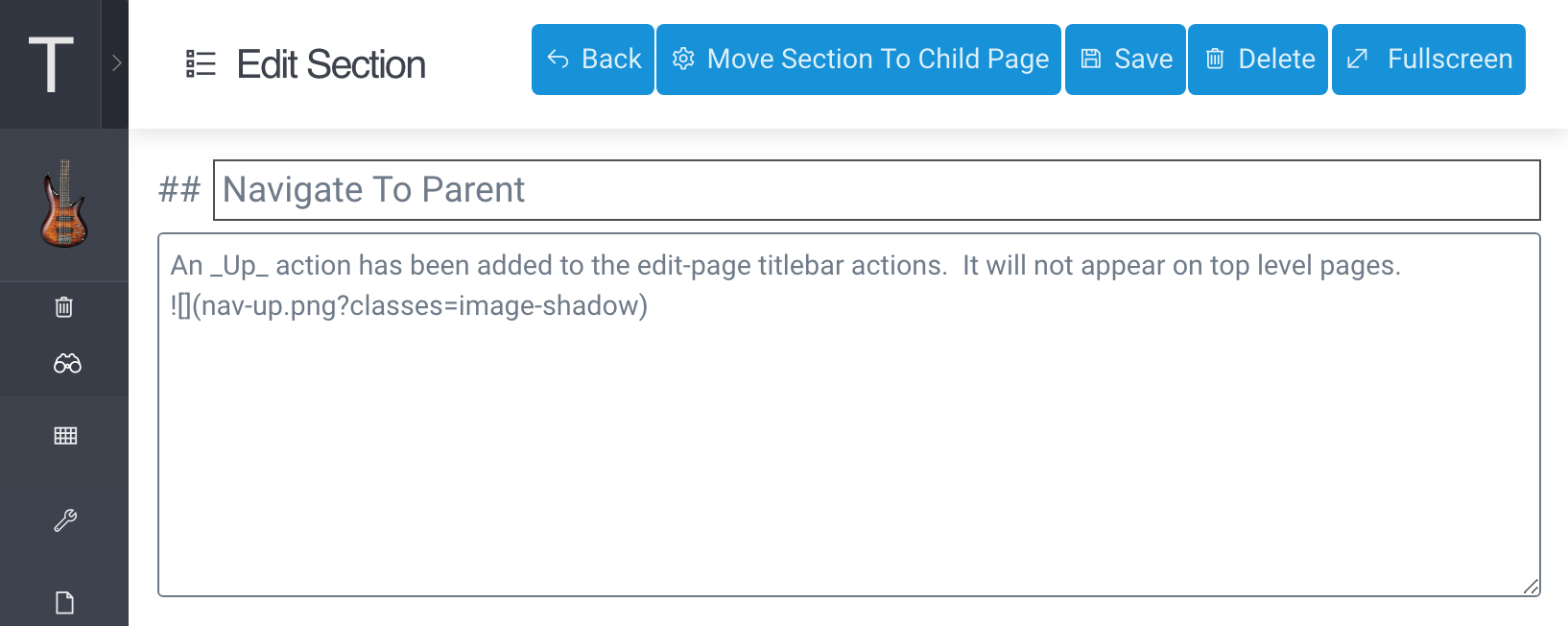 An Up action has been added to the edit-page titlebar actions. It will not appear on top level pages.